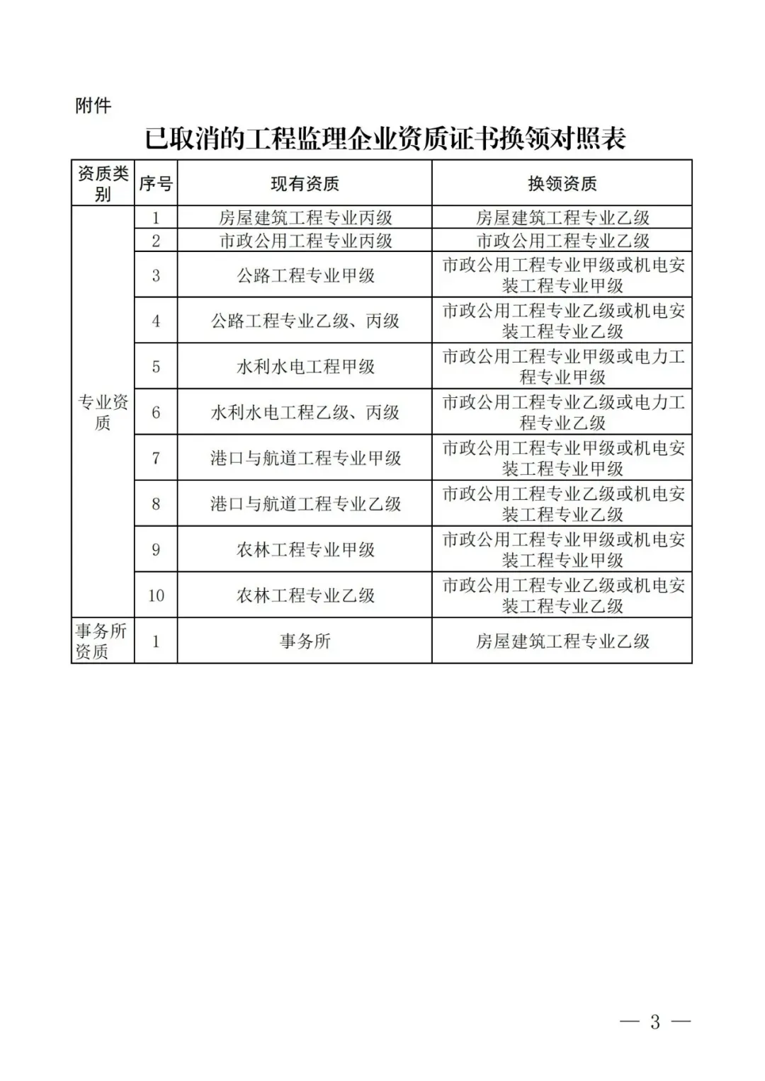 1.对于建筑业企业三级资质(铁路工程施工总承包三级、铁路方面专业承包三级资质除外),应申请换发相同专业二级资质。对于工程监理企业丙级资质以及部分监理乙级资质,应按《已取消的工程监理企业资质证书换证对照表》(详见附件),申请换发相应专业等级资质。